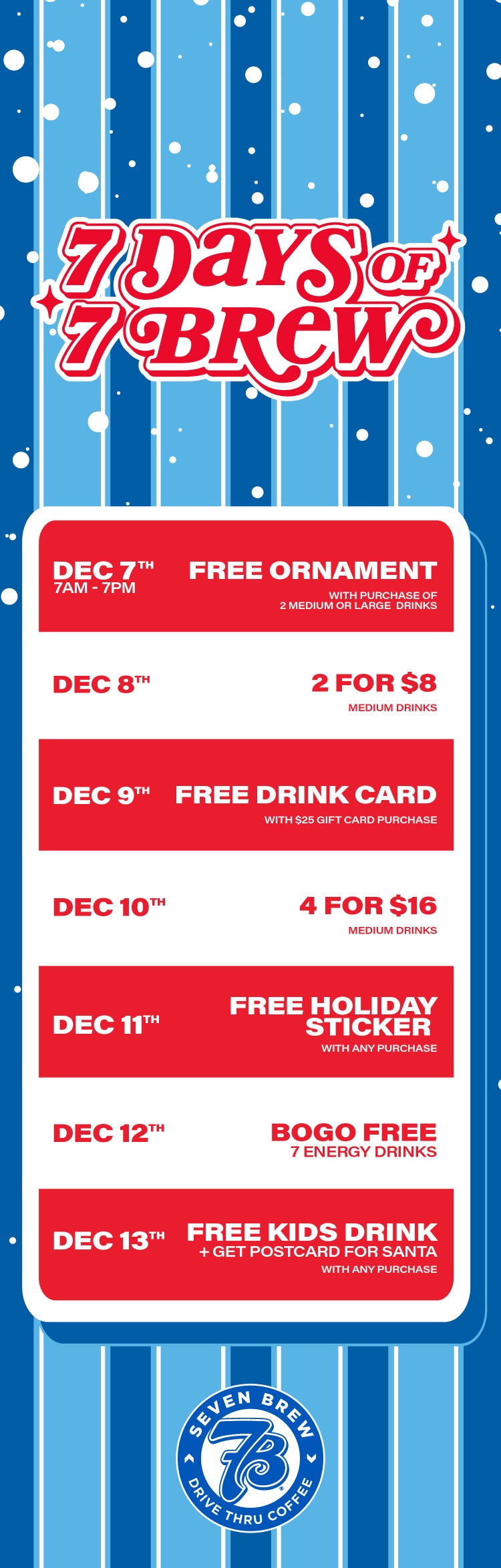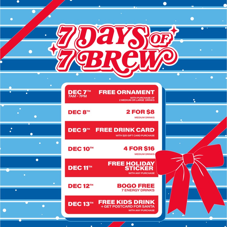 This celebration is one of our favorite traditions, featuring a full week from 12/7 to 12/13 of exciting giveaways and amazing deals designed to spread kindness and show our appreciation for our incredible customers who make 7 Brew special all year long. Each day brings something special, and all offers run from open to close except for Sunday, 12/7, when we will be gifting a festive ornament with every purchase from 7 AM to 7 PM.