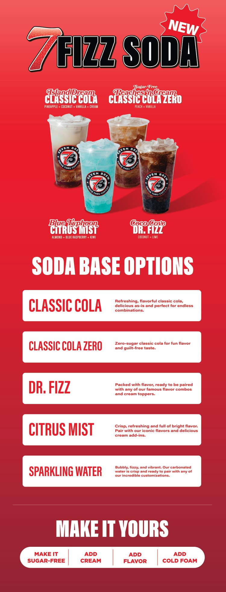 We’re testing Classic Cola, Classic Cola Zero, Citrus Mist, and Dr. Fizz, as we explore new ways to add even more customization and variety to the menu. You can try the recommended flavors (Island Dream, Peaches N Cream, Blue Typhoon, and Coco Cove) year-round in any of our other products, like Sparkling Water, 7 Energy, or Lemonade.