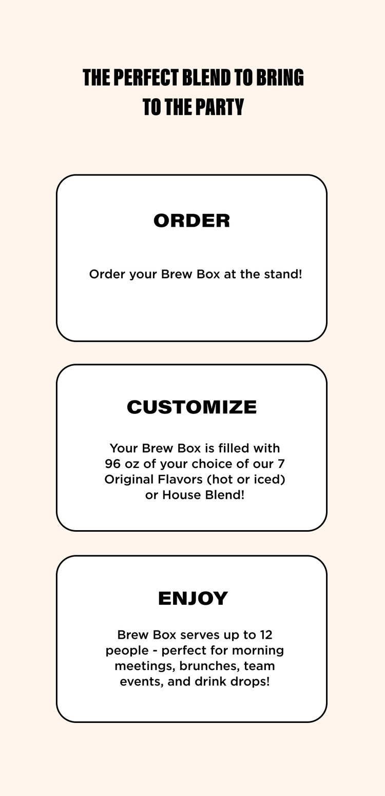Each Brew Box provides up to 12 drinks, making it ideal for office settings, special events, or a boost on game day.