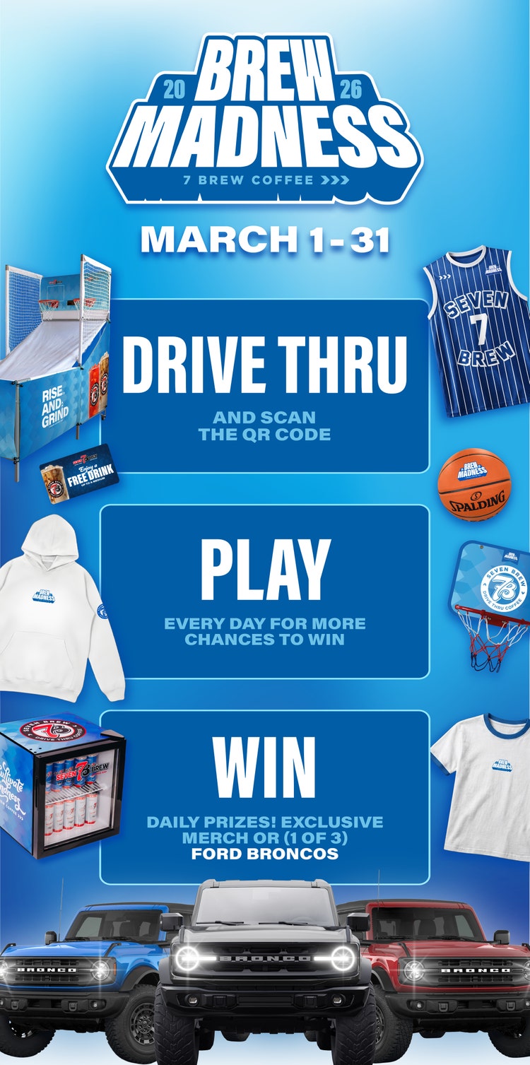 Swing by your nearest 7 Brew, scan the Brew Madness QR code on our drive‑thru digital boards or outdoor signage in the drive‑thru, and play! ⚡️