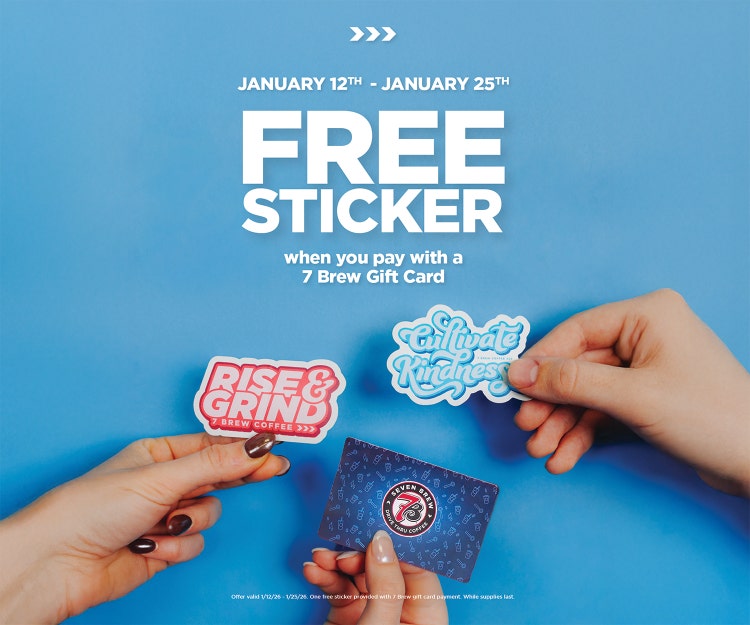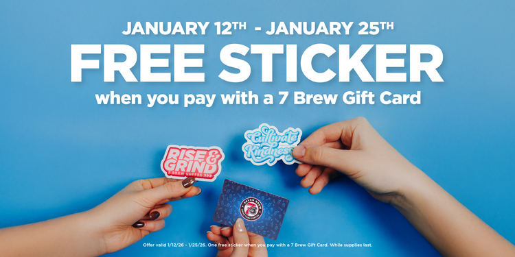 The sticker promo only applies to purchases made with a 7 Brew Gift Card from January 12–25, but don’t worry, we’ve got plenty more fun giveaways coming this year for awesome guests like you!